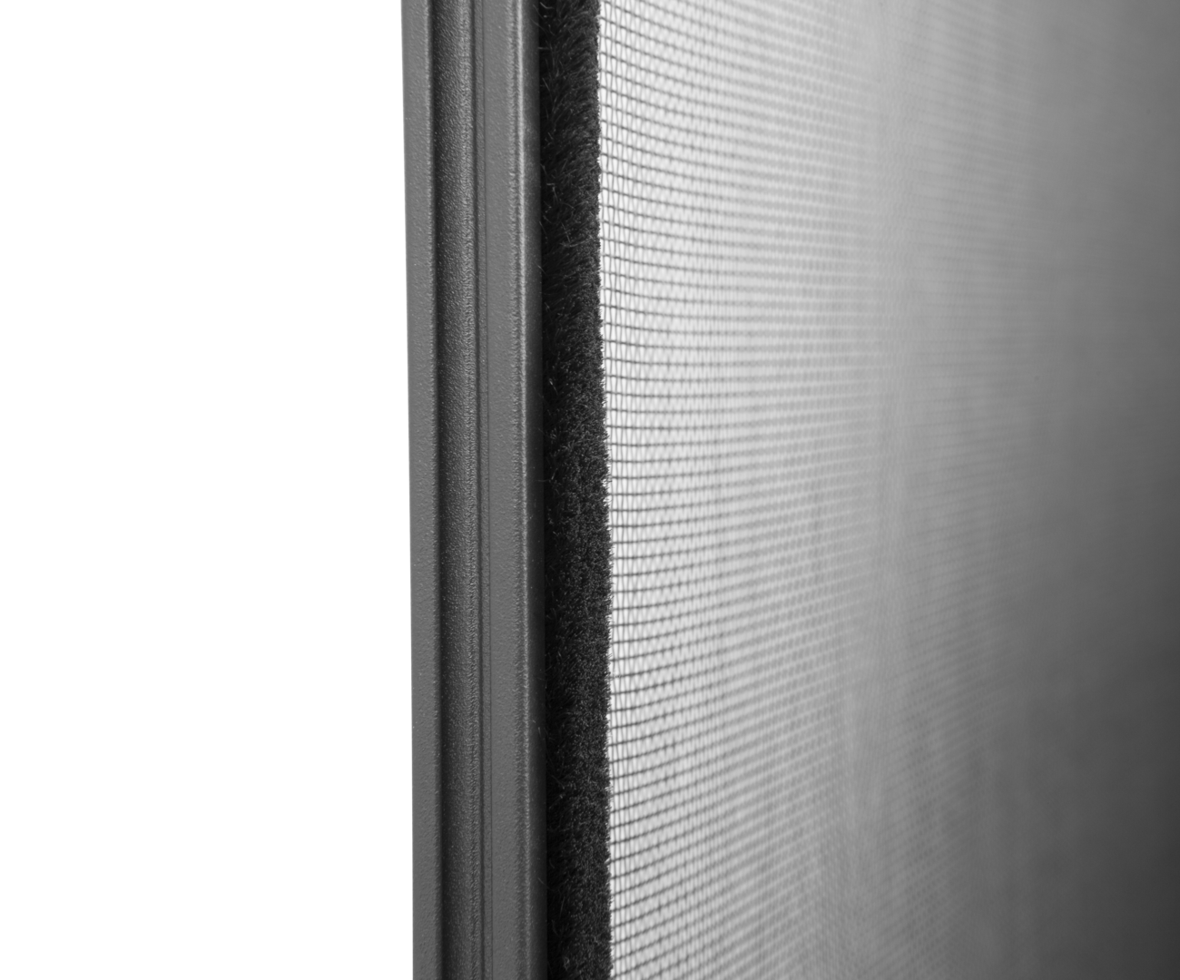 Die Laufrollen in der oberen Führungsschiene sorgen für ein leichtes Öffnen und Schließen der Insektenschutz-Schiebetür. Der Griff ist unauffällig und passt perfekt zum Design des Produkts. Durch die Mittelsprosse wird zusätzliche Stabilität gewährleistet.